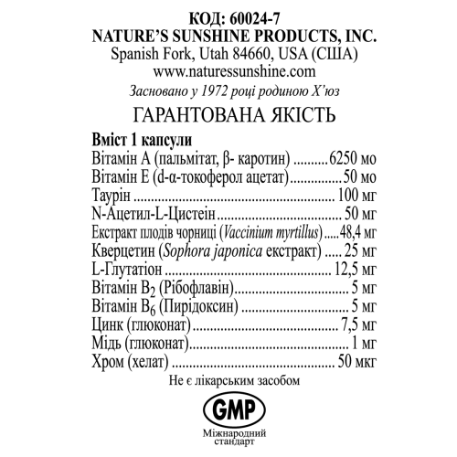 Экстракт сока черники (Vaccinium myrtillus) – стимулирует выработку зрительного пигмента родопсина и обладает сильным антиоксидантным действием, что значительно повышает остроту и расширяет поле зрения, снижает усталость глаз, ускоряет обновление клеток сетчатки. Янтарная кислота, которой много в чернике, способствует сохранению эластичности стенок кровеносных сосудов.